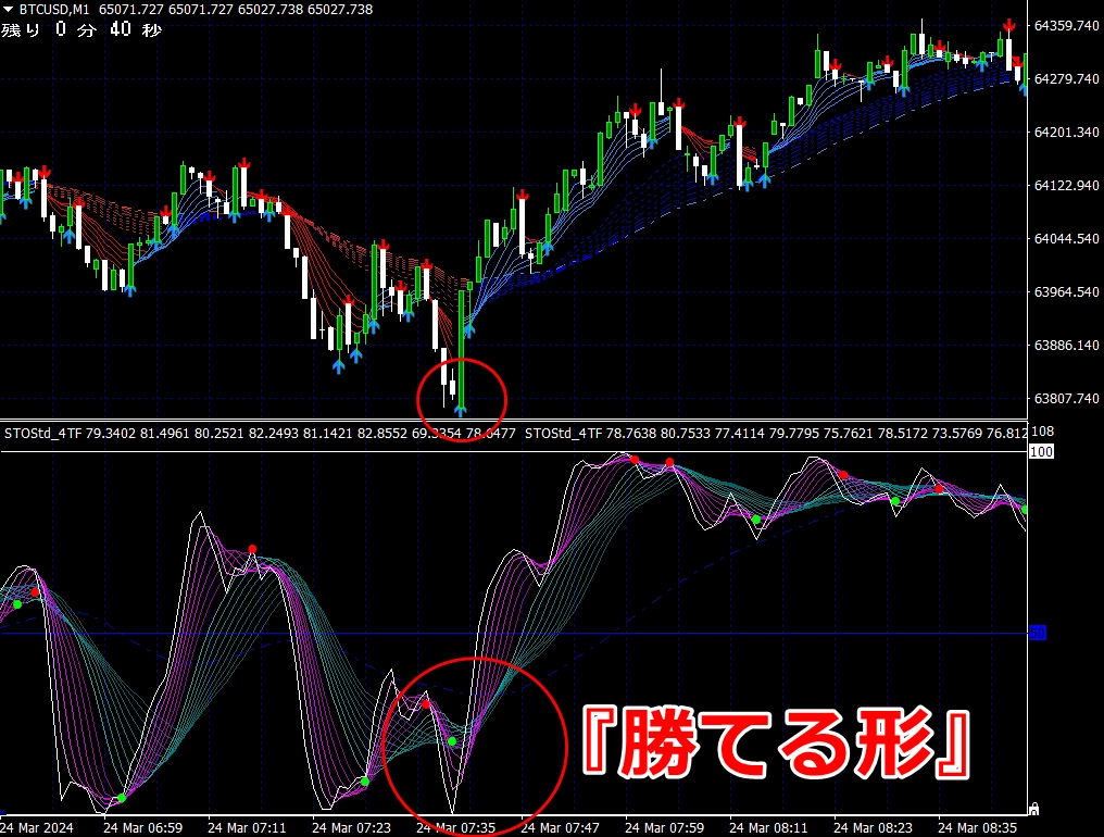 ② 矢印サイン点灯状態で、インジケーターのピンク色の帯が、緑の帯を下からすくい上げるような形状であれば、現在のローソク足が確定する数秒前か確定の直後に1分判定または3分判定でハイエントリーします。
