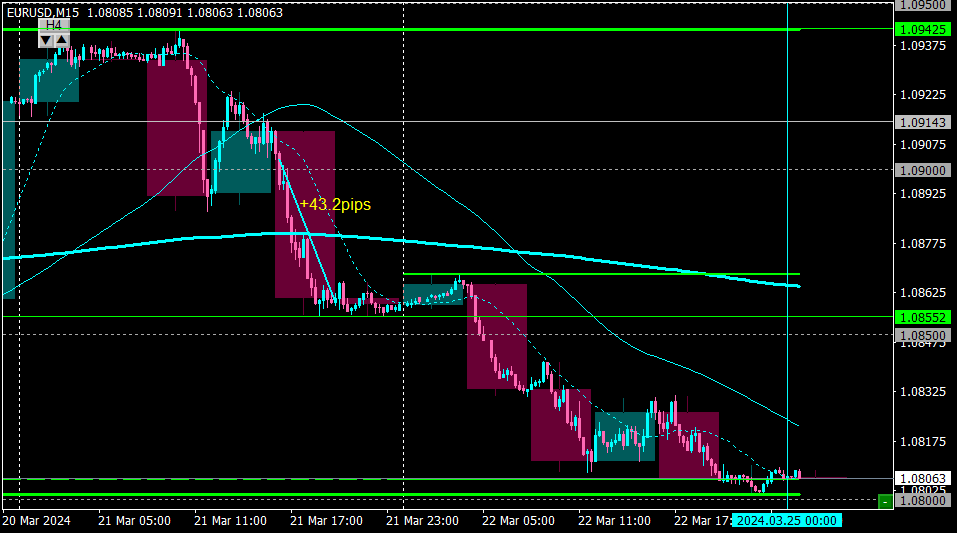 先週の金曜は、注目していた節目1.0850を下抜いたが、その後ダラダラ下げたのと、1.080が次のサポート候補で値幅が大きく取れなかったためノートレード。