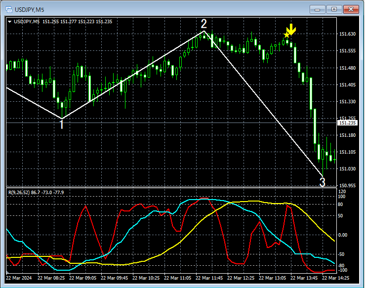 上の5分足では、第3波の初動でmBDSR(RCI2本フィルター)の戻り売りサインが点灯し下げている。