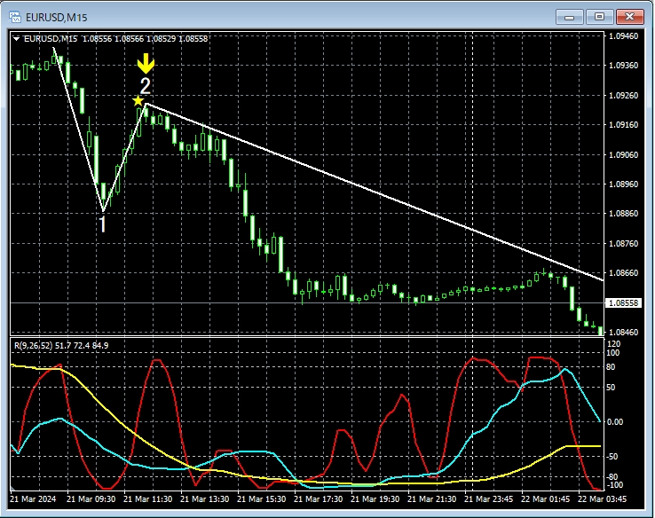 上の5分足では、第3波の初動でmBDSR(RCI2本フィルター)の戻り売りサインが点灯し下げている。