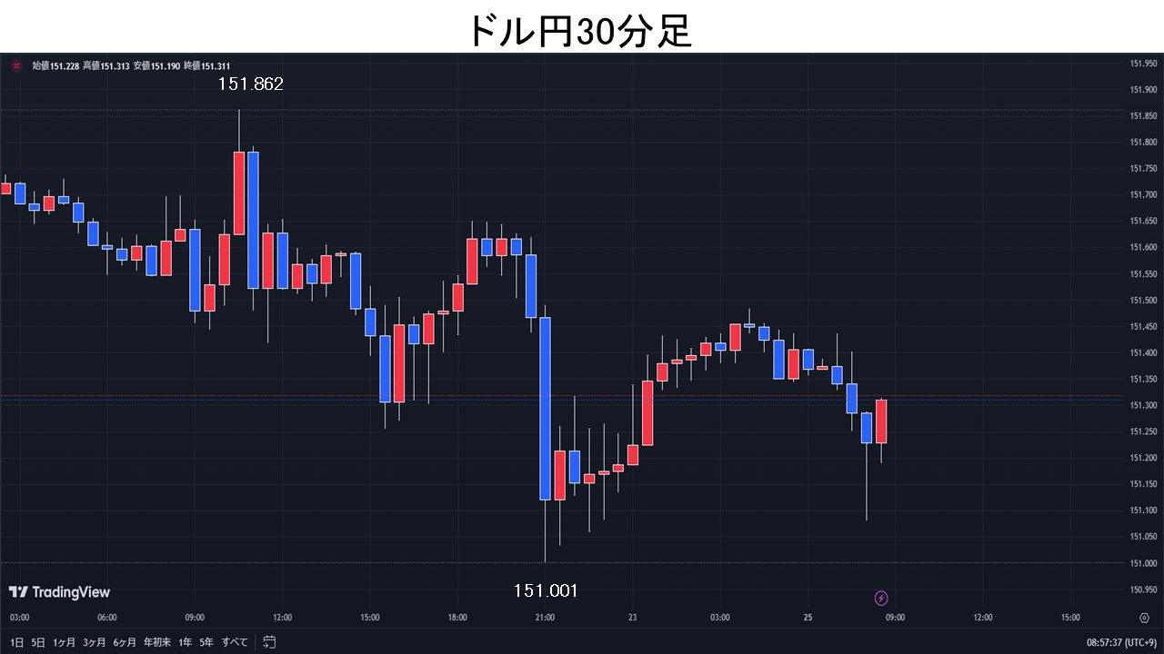 東京時間、ドル円は一時151.86円と年初来高値を更新するが、その後は時間外の米10年債利回りの低下を受け151.40円前後に失速。欧州時間、ドル円は151円台前半で小動き。NY時間、ドル円は週末のポジション調整の売りなどで151.00円まで下落。その後は151.48円まで買い戻された。