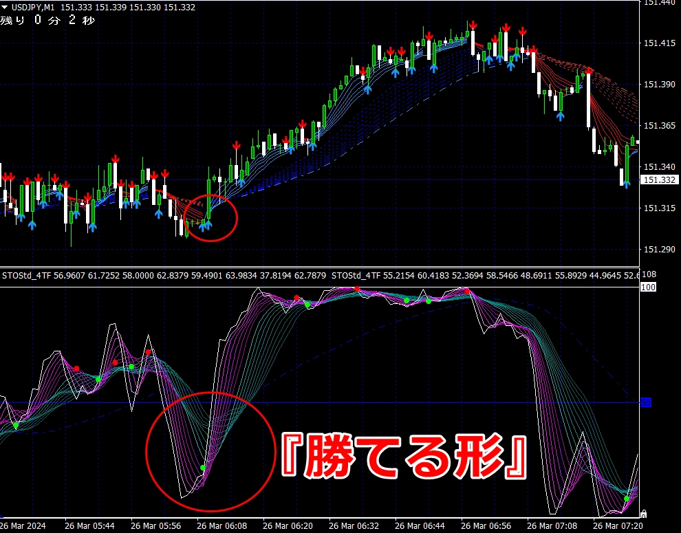 ② 矢印サイン点灯状態で、インジケーターのピンク色の帯が、緑の帯を下からすくい上げるような形状であれば、現在のローソク足が確定する数秒前か確定の直後に1分判定または3分判定でハイエントリーします。