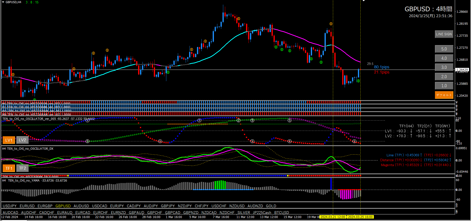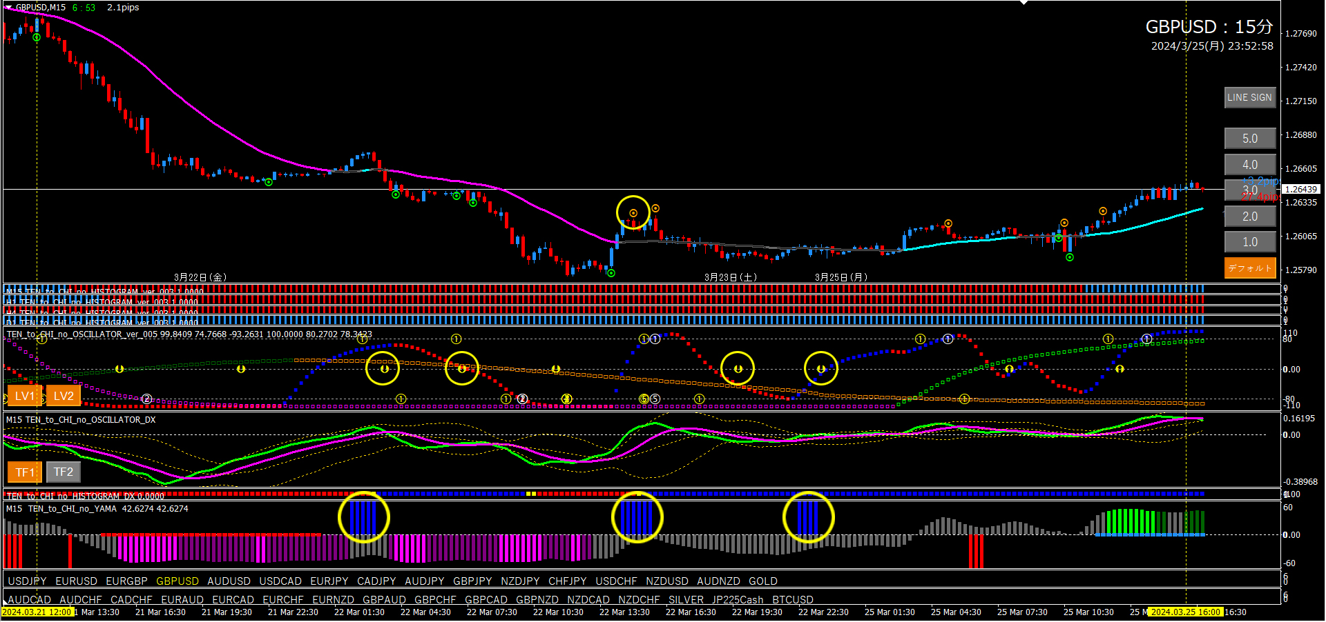 オシレーターTF2が+80から下降中でのショート点サイン。ヒストグラム、ヒストグラムDXも赤ですね。良い根拠が揃っています。この時点で下目線と判断しました。その後、ロングの点サインが点灯したので下目線を終了しました。