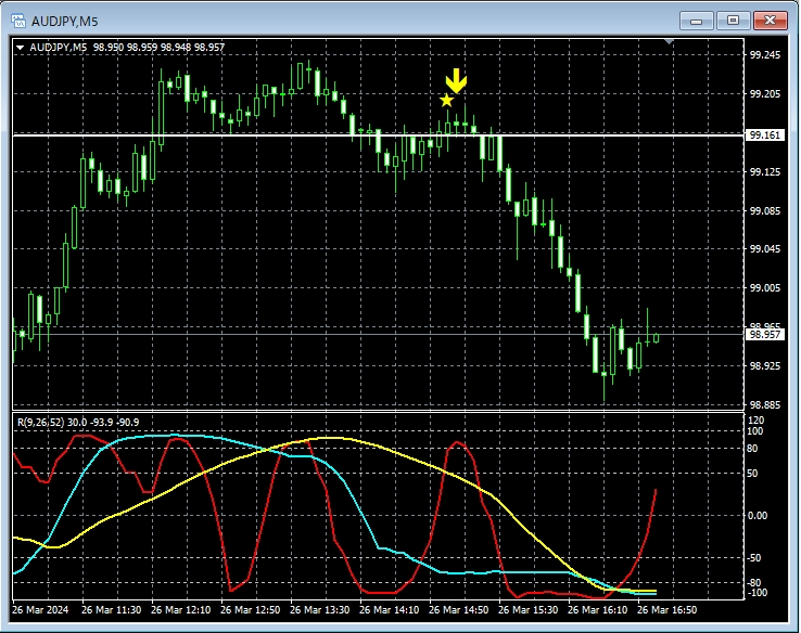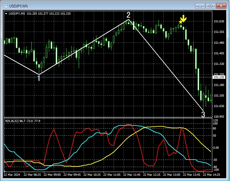 上の15分足では、第3波の初動でmBDSR(RCI2本フィルター)の戻り売りサインが点灯し下げている。