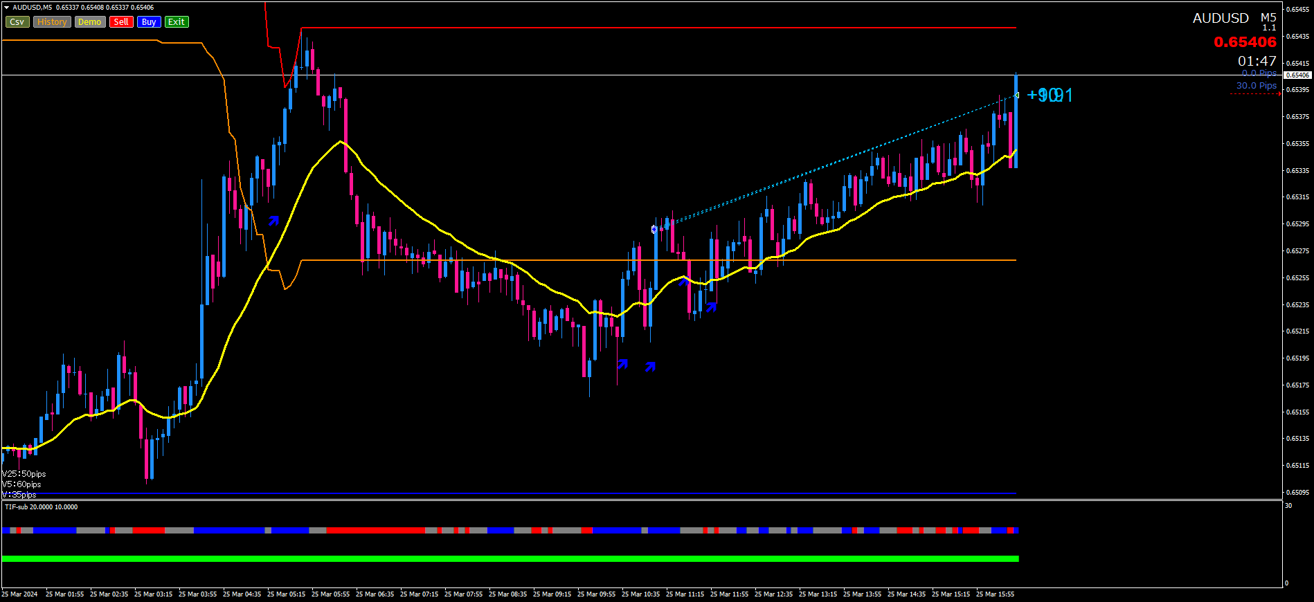 昨日は、5分足でオージードルで基本ルールによる上昇サインが点灯後、ロングエントリーしました。