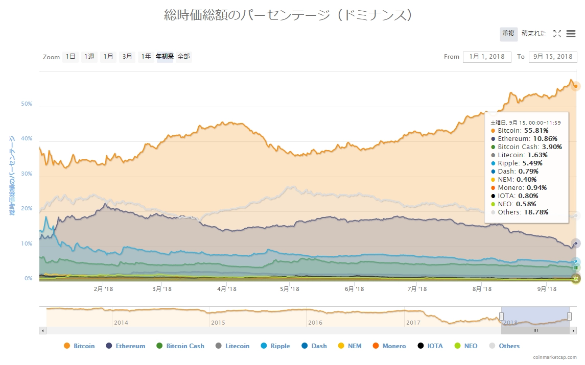 画像は2018年9月16日のキャプチャ。昨日の関心事であった、ビットコインが「緑」を継続できるか否か。結果として継続することができました。そして全体的には「緑」と「赤」が入り交じった、“健全”な状態が今日も続いています。