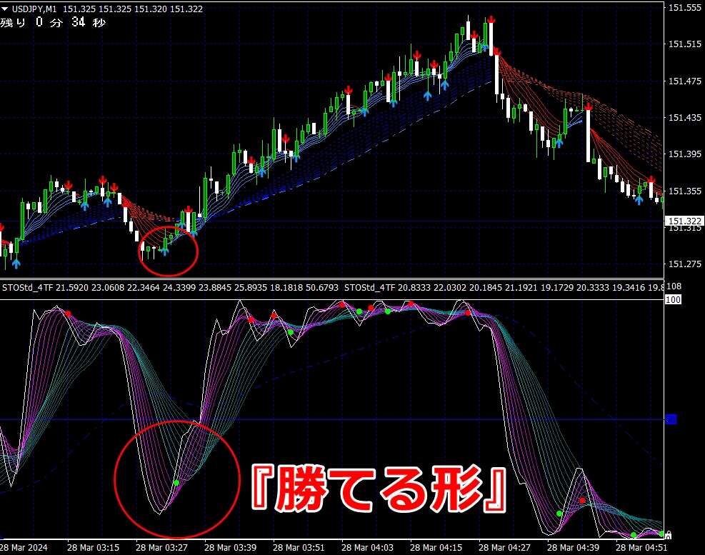 ② 矢印サイン点灯状態で、インジケーターのピンク色の帯が、緑の帯を下からすくい上げるような形状であれば、現在のローソク足が確定する数秒前か確定の直後に1分判定または3分判定でハイエントリーします。