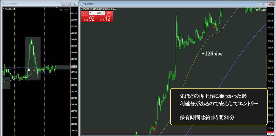 その後また上昇してきたので、さっきの利確分を捨てる勢いで乗りました。