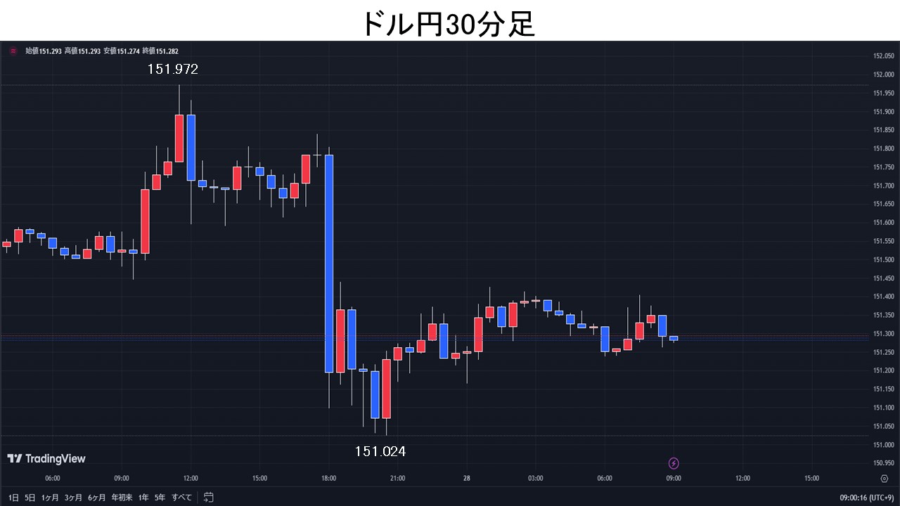 東京時間、ドル円は、田村日銀審議委員のハト派発言をきっかけに151.97円と1990年7月以来33年8か月ぶりに高値を更新。欧州時間、財務省・金融庁・日銀による3者会合が開催されたと伝わると、政府・日銀による為替介入警戒感でドル円は151円台前半へ急落。神田財務官が「過度な為替変動に対してあらゆる手段を排除せずに適切な対応をとる」「(介入の可能性について)文字通りあらゆる手段を排除しない」と述べるとドル円は151.02円まで下落。NY時間、注目される経済指標がない中、ドル円は151円台前半でもみ合い151.31円でクローズをむかえた。