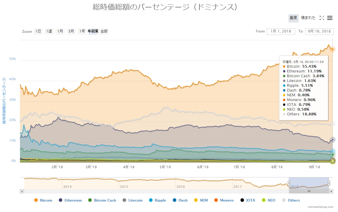 画像は2018年9月17日のキャプチャ。全体的には「緑」と「赤」が入り交じった、相場環境となっています。ビットコインはやや下落していますが、その度合いはわずかです。