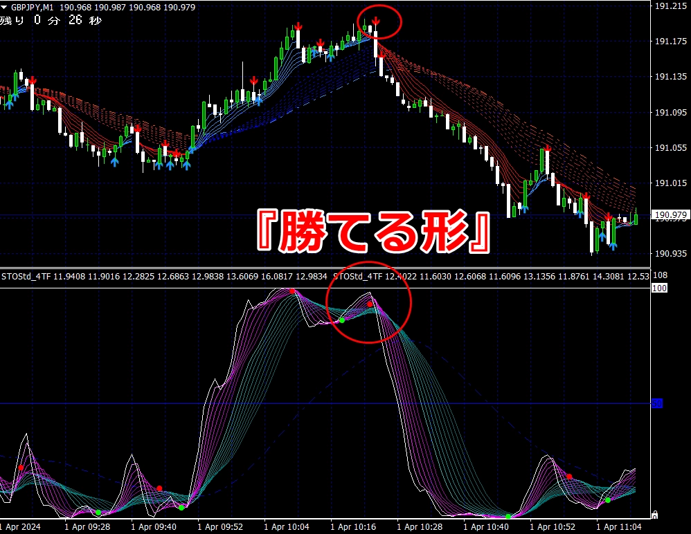 ② 矢印サイン点灯状態で、インジケーターのピンク色の帯が、緑の帯を下からすくい上げるような形状であれば、現在のローソク足が確定する数秒前か確定の直後に1分判定または3分判定でハイエントリーします。