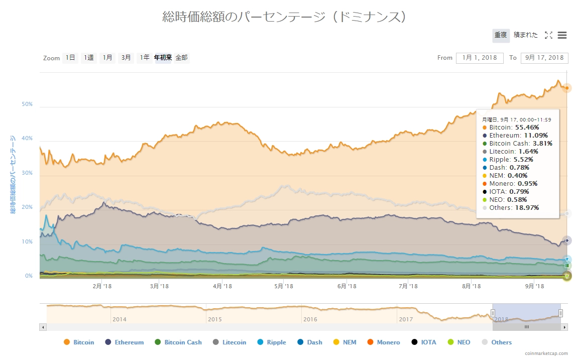 画像は2018年9月18日のキャプチャ。しばらく”凪”ともいえる穏やかな相場環境が続いていましたが、一気に下落方向へ動き出しました。イーサリアム、ライトコイン、ビットコインキャッシュは「真紅」な落ち込みです。