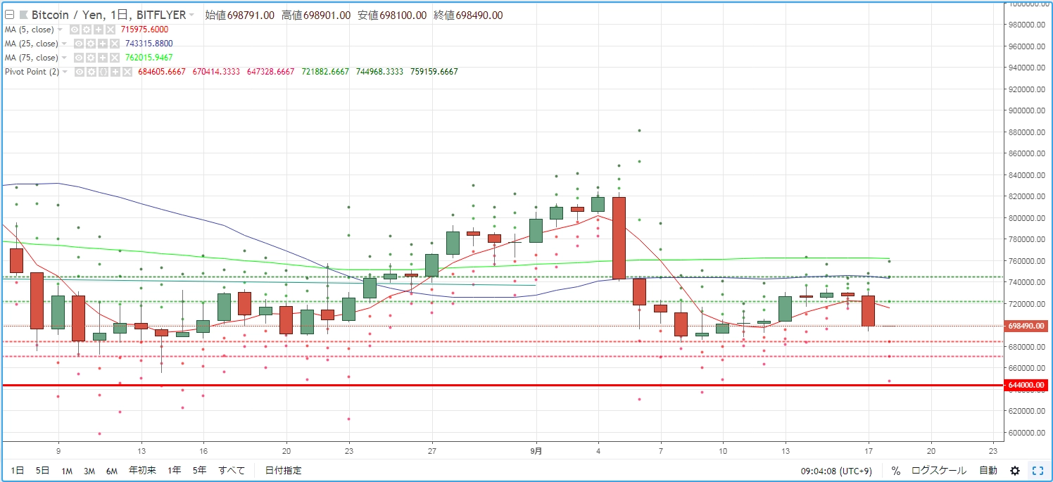 画像は2018年9月19日のキャプチャ。昨日は「真紅」で一気に下落する銘柄が多くありましたが、今日は大なり小なりの反発して「緑」が目立っています。リップルは約17%の反発上昇と、目立った存在となっています。