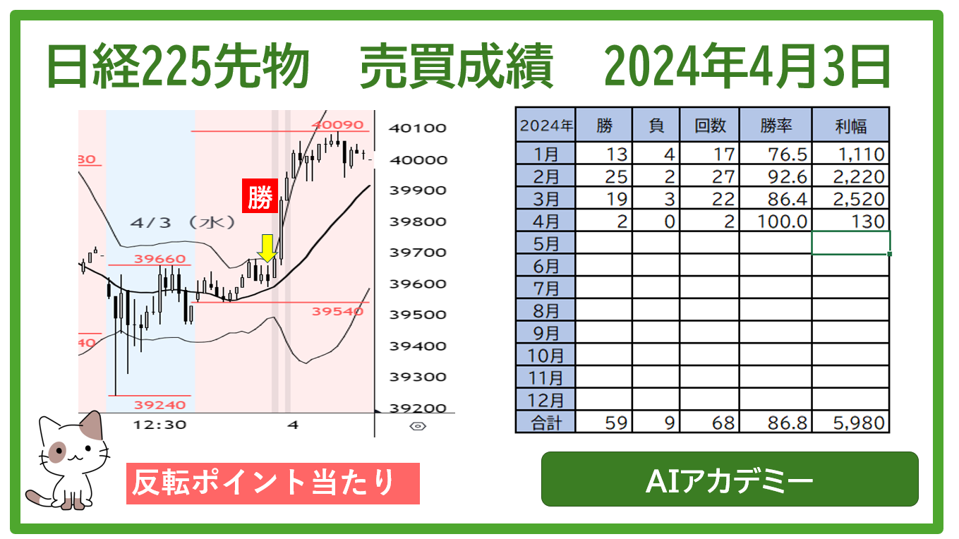 日経225先物 2024年4月3日 (水) 売買ポイントと勝率