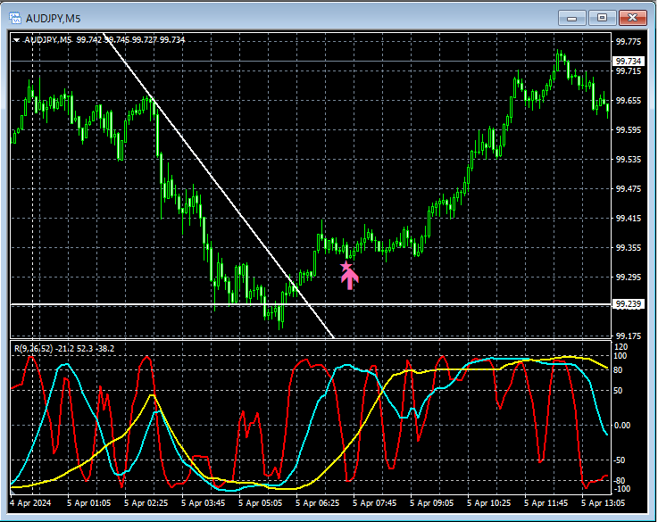 豪ドル円 過去の目立つ高値とカウンタートレンドラインとmBDSR(RCI2本フィルター)の押し目買いサイン 2024年4月5日