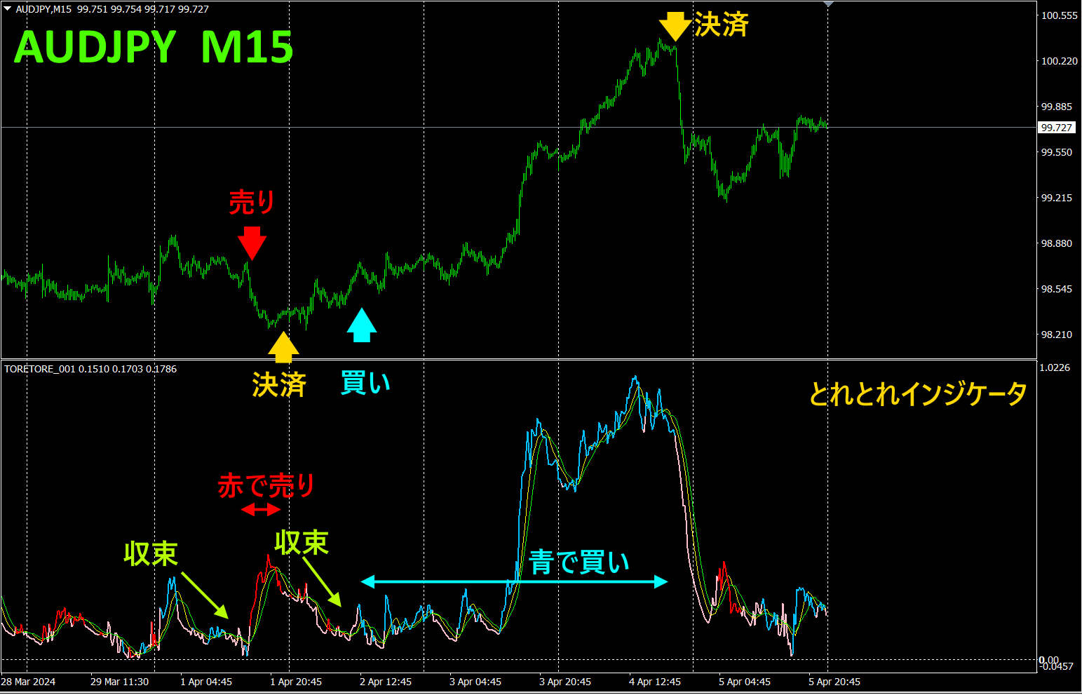AUDJPYの15分足に「とれとれインジケータ」を導入します。インジケータのメイン線が、十分に収束するのを待ってから、トレードを開始します。メイン線の色が赤なら売り、青なら買いです。