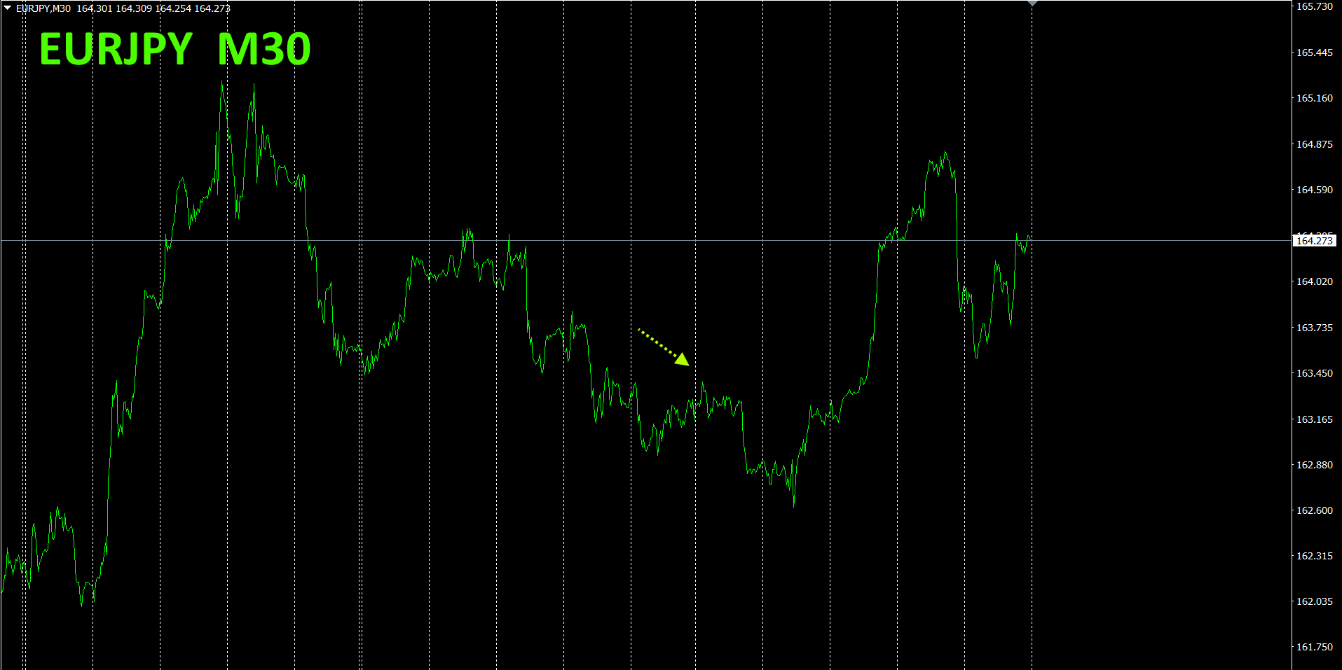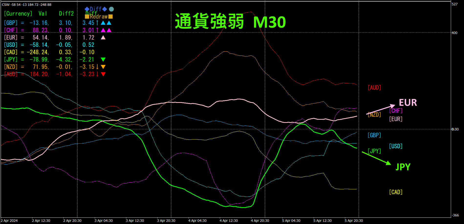 ピンク色がEUR、緑色がJPYです。JPYは下向き、EURは上向きになっていて、通貨強弱もEUR>JPYなので、EURJPYは今後さらに上昇することになります。