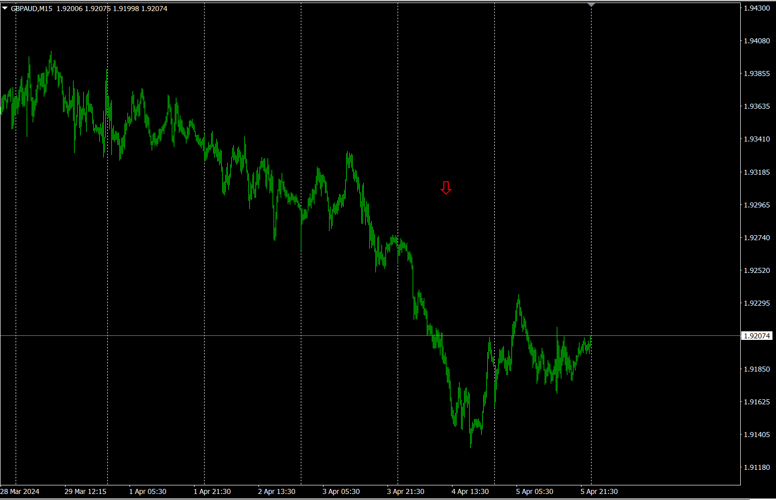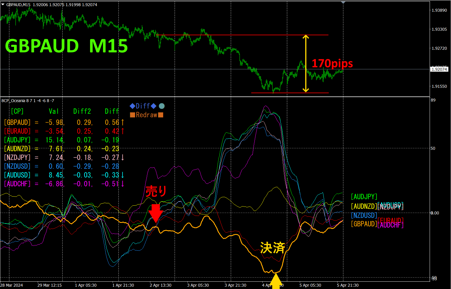 火曜日に、GBPAUD が他のグラフを下抜けてきたので、売りエントリーします。木曜日に決済して、約170pipsの利益が得られました。