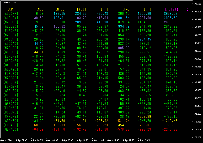 [Total]数値の降順に並んでいます。1番下の行目のGBPAUDは、全ての時間足で赤色の表示色になっていて、Total数値が -2275.83と大きなマイナスの数字になっています。GBPAUDに著しい下降トレンドが発生していることを示しています。