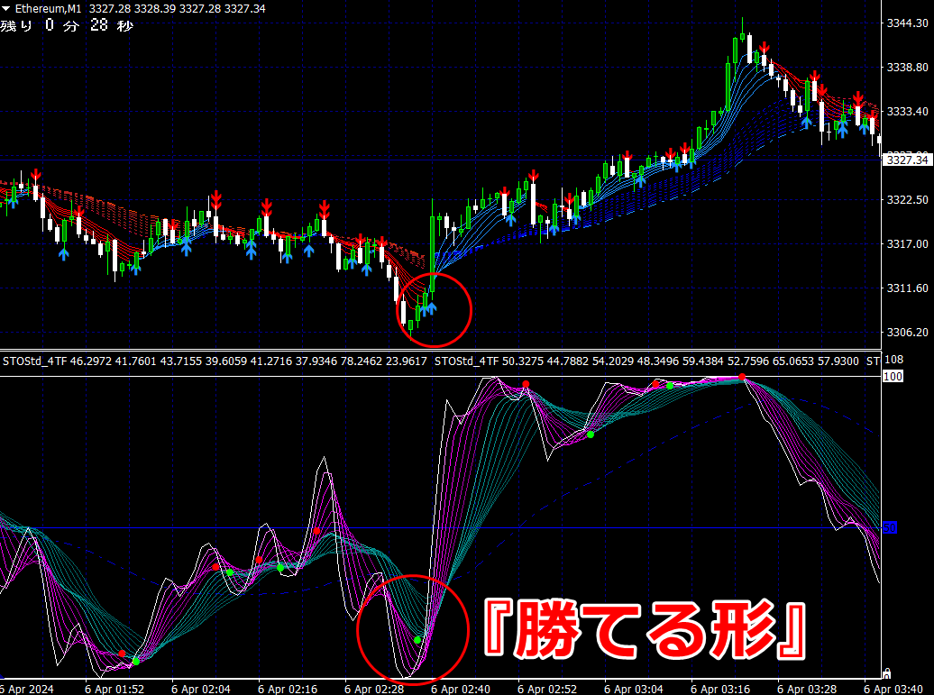 ② 矢印サイン点灯状態で、インジケーターのピンク色の帯が、緑の帯を下からすくい上げるような形状であれば、現在のローソク足が確定する数秒前か確定の直後に1分判定または3分判定でハイエントリーします。