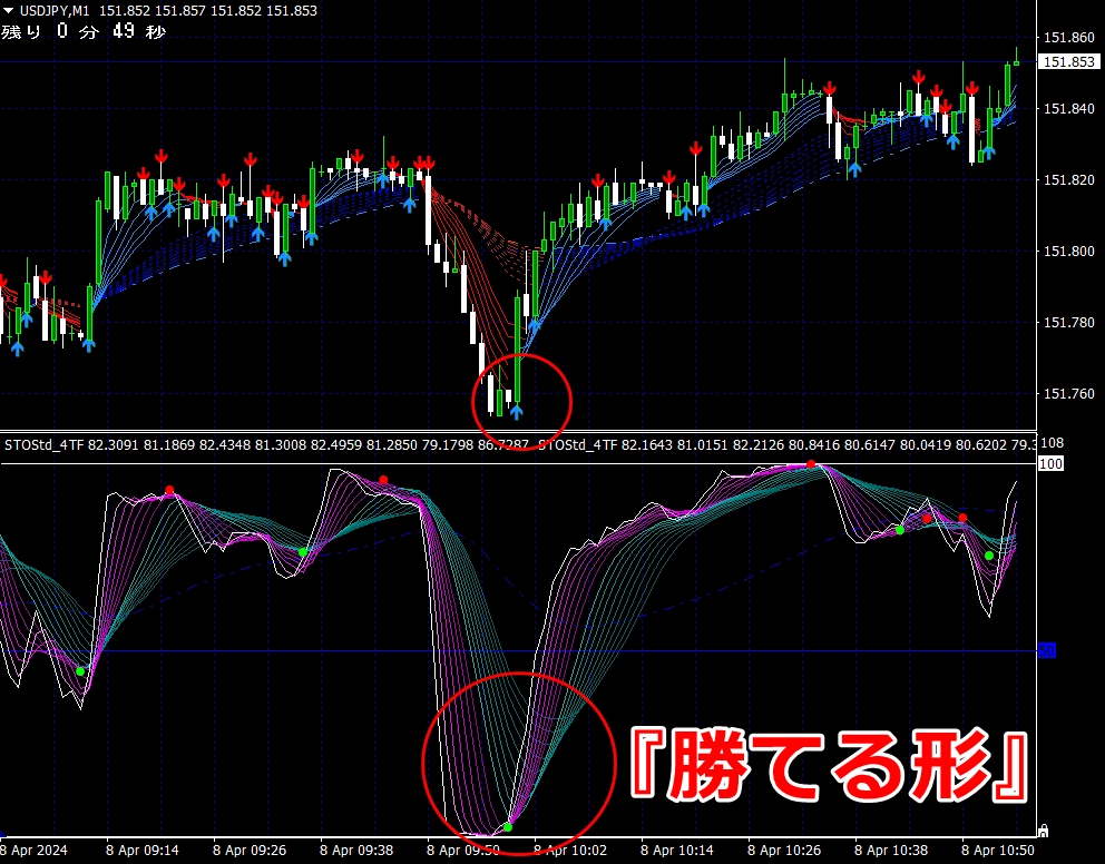 ② 矢印サイン点灯状態で、インジケーターのピンク色の帯が、緑の帯を下からすくい上げるような形状であれば、現在のローソク足が確定する数秒前か確定の直後に1分判定または3分判定でハイエントリーします。