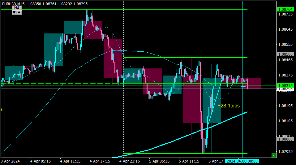 雇用統計の発表後に注目していた節目1.080まで急落したので、その反発を狙ってロング。+28.1pips