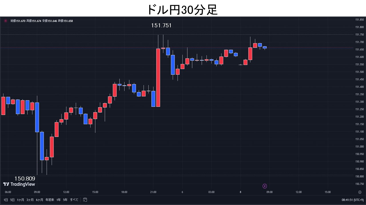 米雇用統計予想上振れ、ドル円は151.75円まで反発。