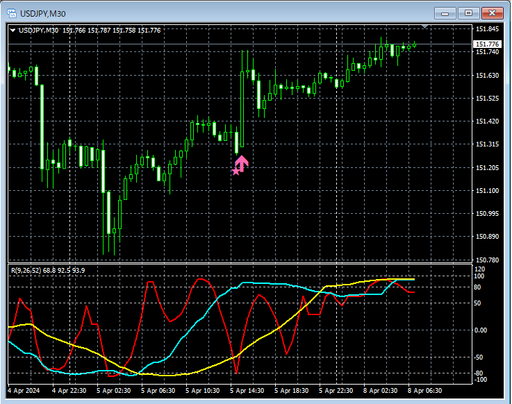上の30分足では、米雇用統計の発表で大きく上昇している。上昇開始直前にmBDSR(RCI2本フィルター)の押し目買いサインが点灯している。