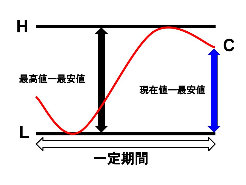 ②一定期間の最高値と最安値の幅を1とした時に、最安値を基準として何%の位置に価格があるかということ。