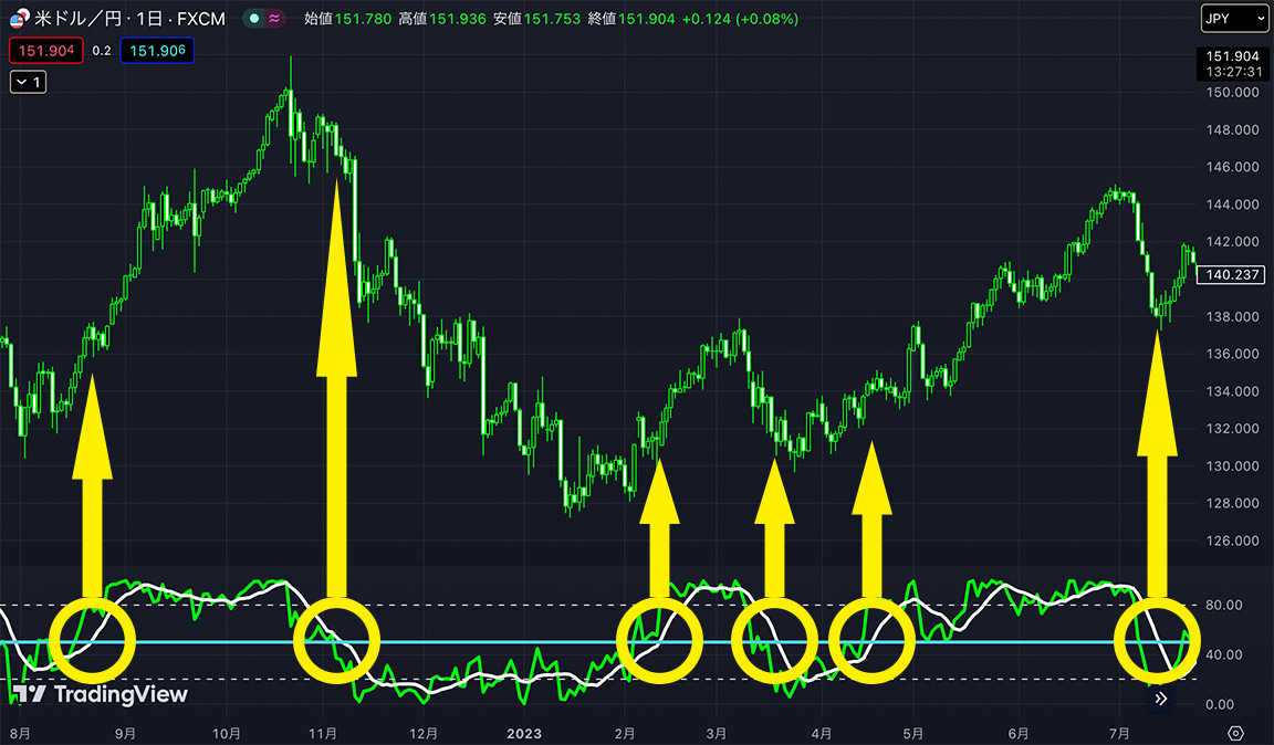 %Kが50%を下抜けしたのを確認し、%Dが50%を下抜けしたら売り。