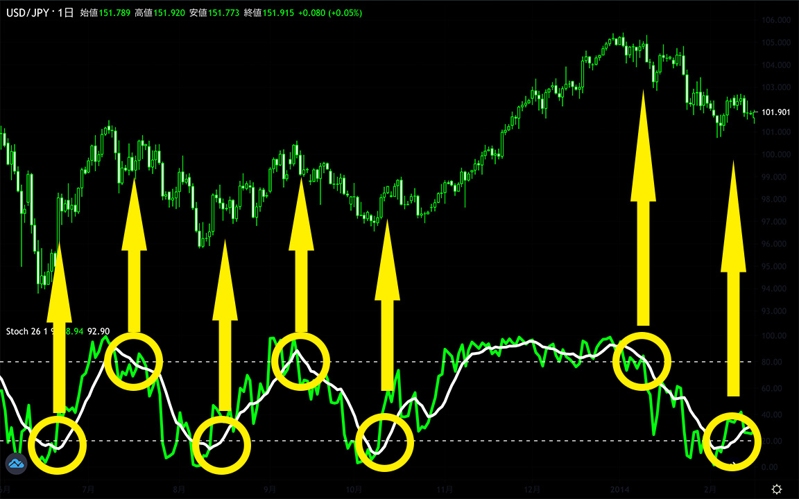 このことから、%Kは80%以上を推移するときは上昇トレンド中だから、買われすぎだから売りサインとはならない。20%以下も同様。
