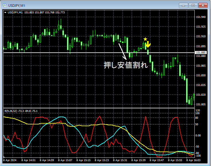 ドル円 1分足 2024年4月8日