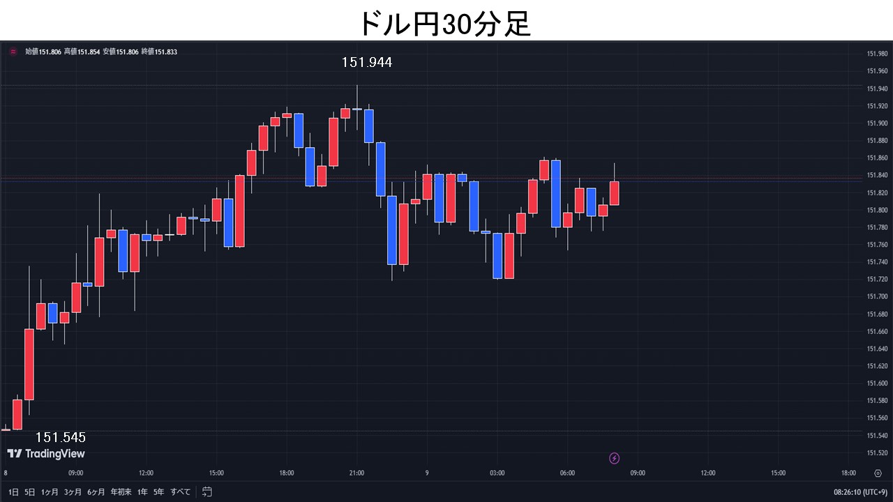 東京時間、ドル円は日経平均の大幅上昇を受け151.82円まで上昇となるが、政府・日銀による円買い介入警戒で追随する買いはなかった。欧州時間、ドル円は151円台後半で膠着。NY時間、米利下げ開始時期が後ずれするとの観測の中、米10年債利回りの上昇を受けドル円は151.94円まで上昇。その後は、米10年債利回りが低下し、政府・日銀による円買い介入警戒感などで151.72円前後まで下押し。