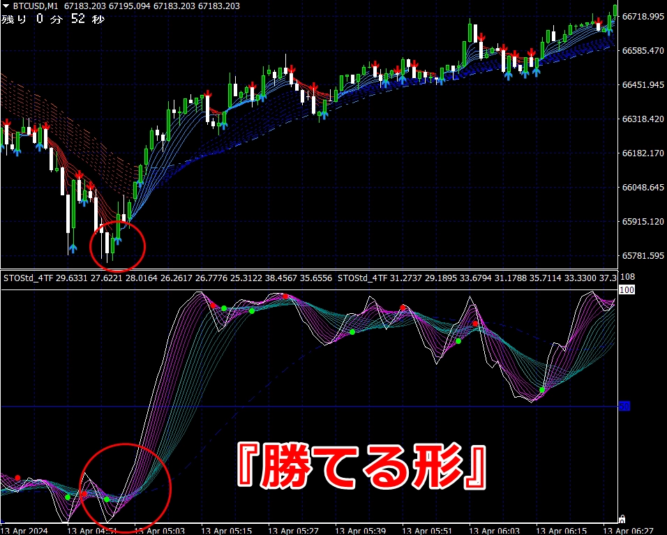 ② 矢印サイン点灯状態で、インジケーターのピンク色の帯が、緑の帯を下からすくい上げるような形状であれば、現在のローソク足が確定する数秒前か確定の直後に1分判定または3分判定でハイエントリーします。