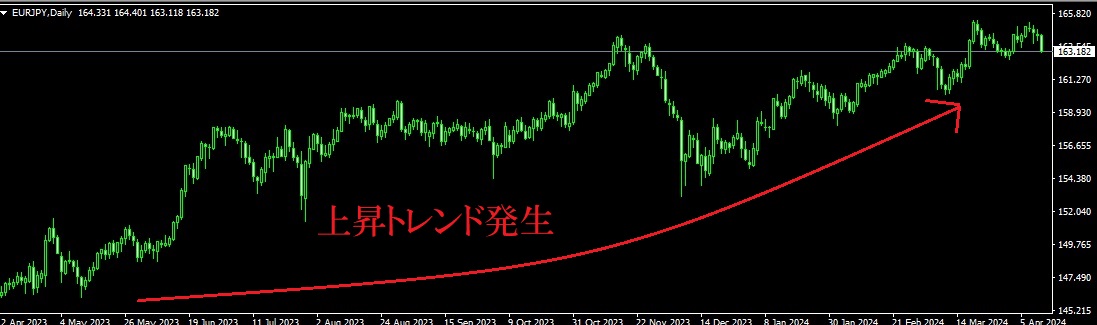 イメージとしてはこんな感じです。画像はユーロ円の日足チャートです。