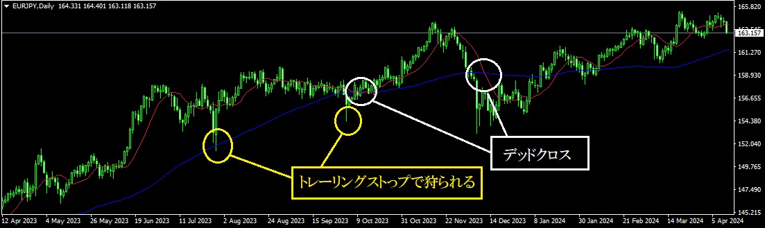 うまく上昇トレンドの波にのれば、トレーリングストップの利点を生かしてうまく立ち回れるように思われます。