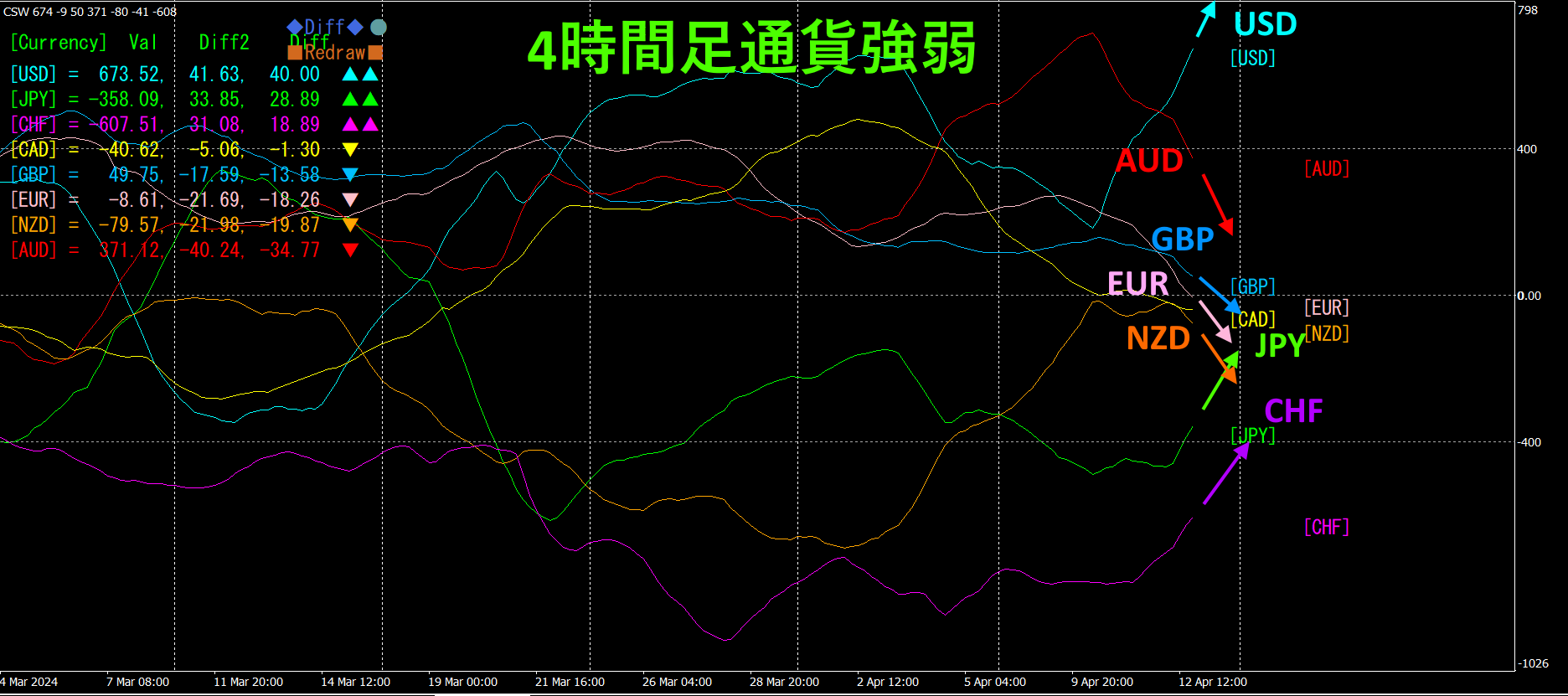 4時間足では、USD、JPU、CHFが上昇しています。一方、AUD、NZD、EUR、GBPが下向きになっています。