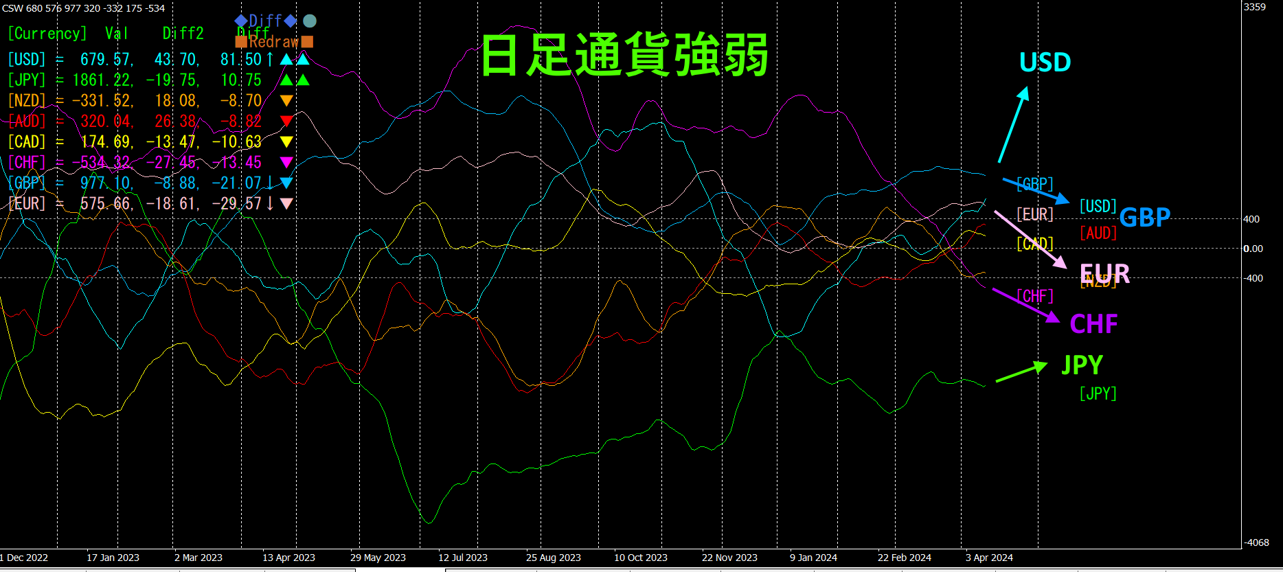 USD、JPYが上向きです。一方、EUR、CHF、GBP、CADは下向きになっています。日足チャートではUSDの上昇とEURの下落が著しいです。