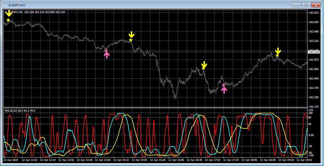 2024年4月12日(金)の1分足チャートから。mBDSR(RCI2本フィルター)の押し目買いサインと戻り売りサインの例。