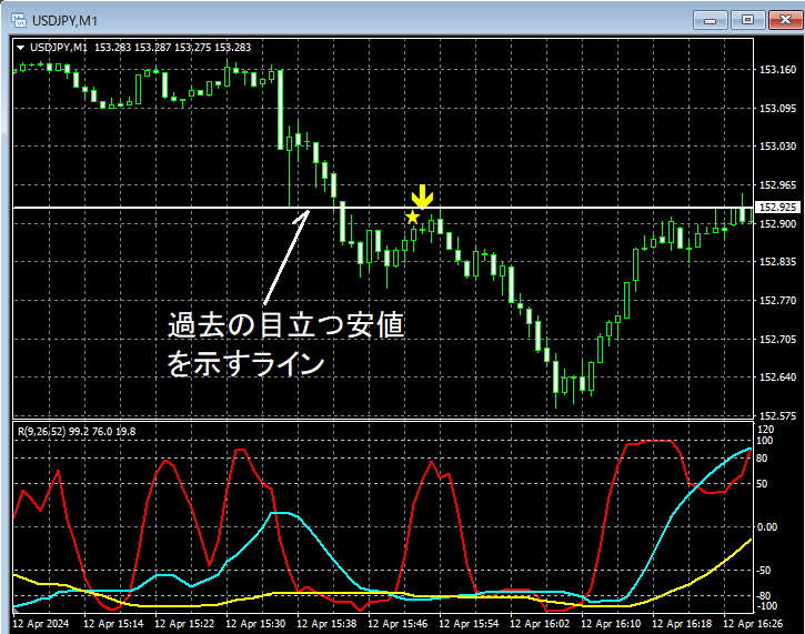 ドル円 1分足 過去の目立つ安値とmBDSR(RCI2本フィルター)の戻り売りサイン