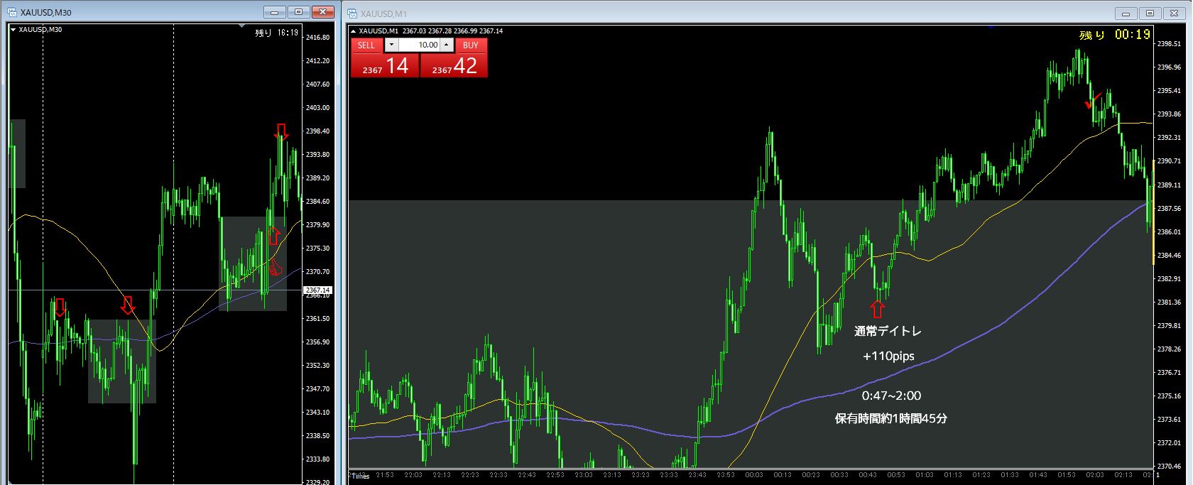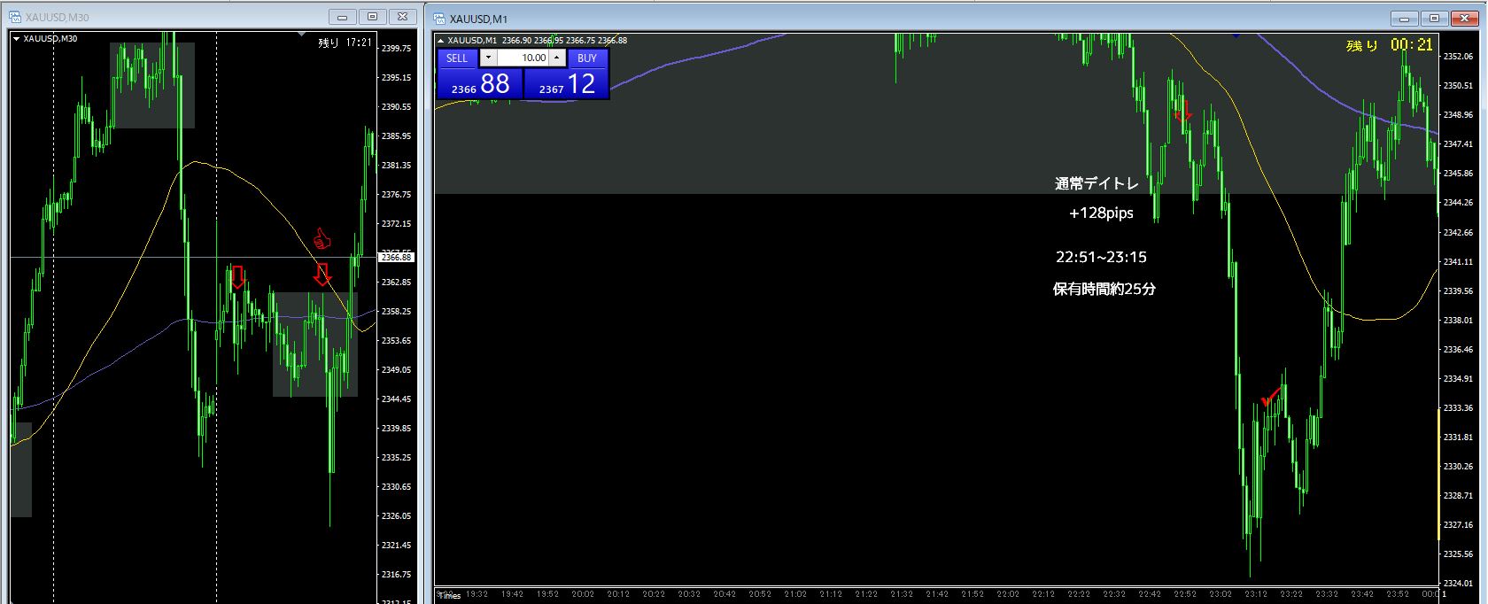 最初はスキャルピングですね。1分ちょっとでこれだけ取れるって本当にゴールドの威力はすごいです…