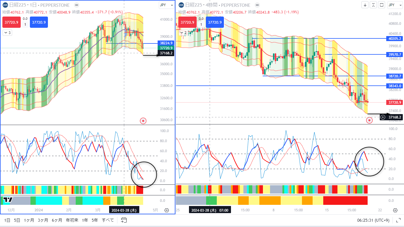 ※日足MAXオシレーターは反転警戒域に突入しているが、4時間足は下にいけいけの状態で、上がりにくい形