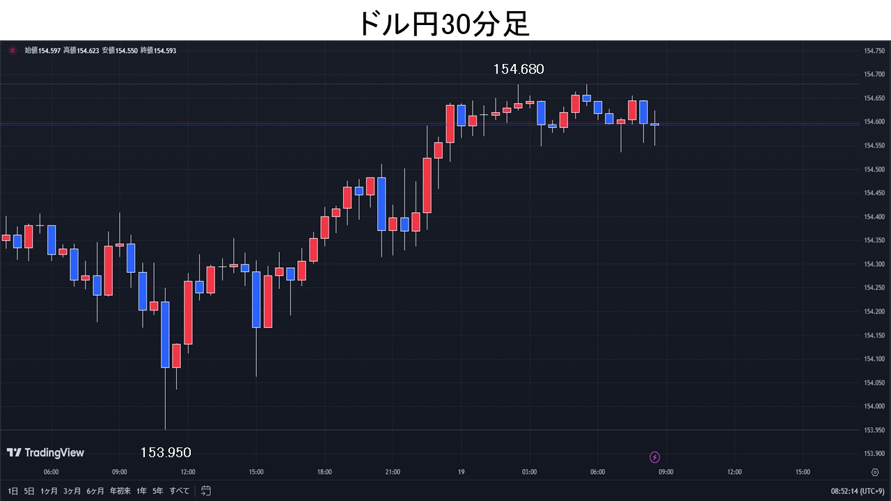 東京時間、ドル円は時間外の米10年債利回り低下を受け、神田財務官が「為替の過度な変動や無秩序な動きは経済金融に悪影響」等の発言で一時153.95円まで下押しとなった。しかし、G7における声明文の中で、為替に関する事項は後半に付け足された内容であることがわかると、ドル円は154.30円台まで買い戻された。欧州時間、ドル円は154円台前半で小動き。NY時間、4月米フィラデルフィア連銀製造業景気指数(フィリー指数)が予想を大きく上振れると、米10年債利回りの上昇とともにドル円は154.68円まで上昇。また、ウィリアムズ米NY連銀総裁が「利下げの緊急性は感じていない」「利上げは私の基本的な予想ではないが、データが要求するならFRBは利上げするだろう」などと発言し、ボスティック米アトランタ連銀総裁は「米国のインフレは高すぎる」「2%へのインフレ低下の道のりは緩慢で険しい」「年末に近づくまで利下げに踏み切ることは適切ではない」などと発言と、米要人のタカ派発言でドル円は堅調。