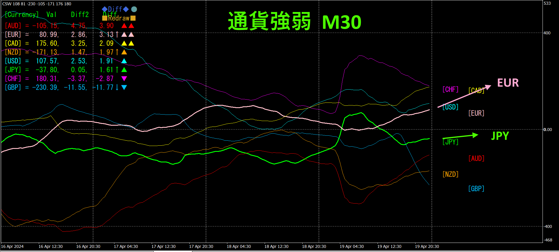 ピンク色がEUR、緑色がJPYです。通貨強弱としては、EUR>JPYで、ベクトルは、どちらも上を向いていますが、JPYは弱い上向きに、EURはJPYよりも強い上向きになっているので、今後EURJPYは上昇するものと考えられます。