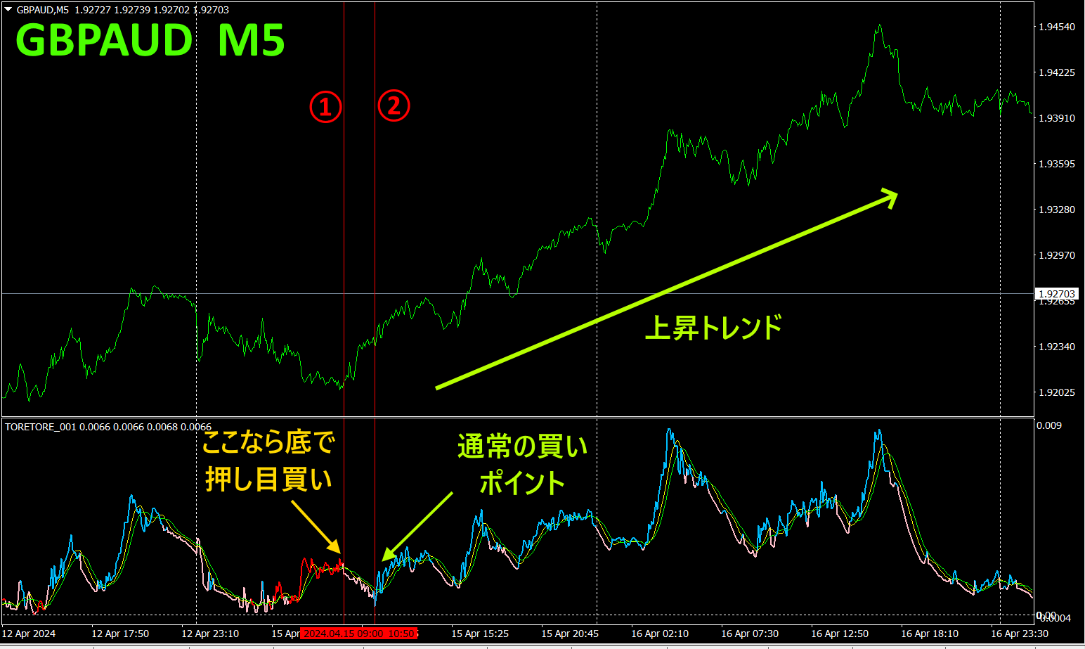 通常の買いポイントは、「とれとれインジケータ」のメイン線が収束してから、青に変わった所(②の垂直線の位置)なのですが、全体の流れが上昇トレンドになっているので、インジケータのカラーが赤色からピンクに変わった所(①の垂直線の位置)で、買ったならば、上昇トレンドの、押し目の「底」位置での押し目買いができるわけです。