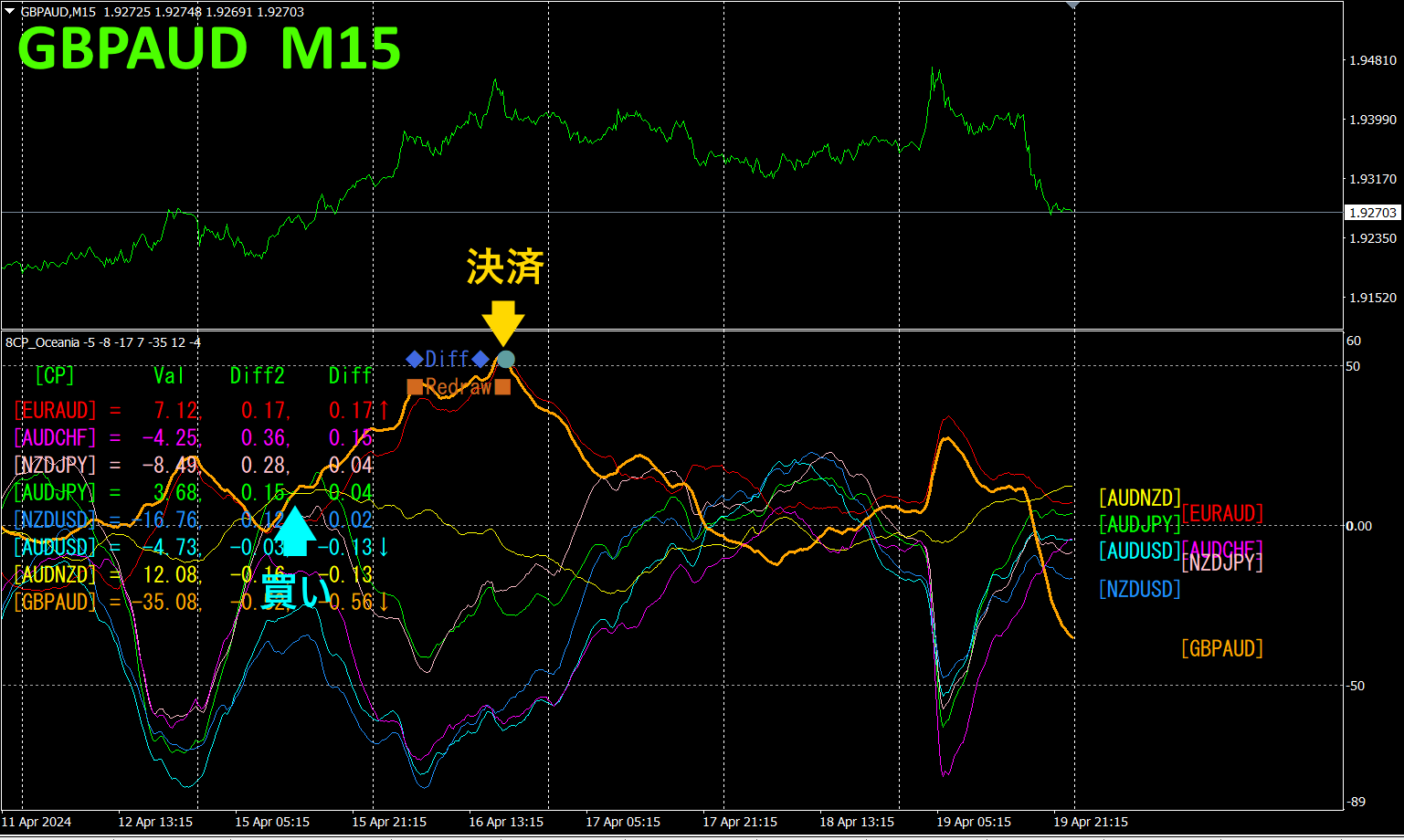 上半分は、GBPAUDの15分足チャートです。下半分は、「8CP見える化インジケータ」によるものです、橙色太線のグラフがGBPAUD に相当します。