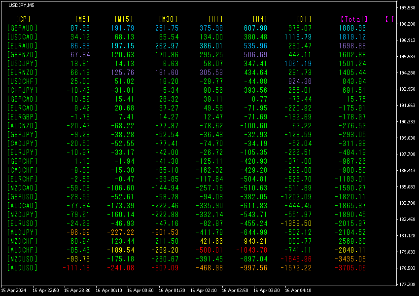 [Total]数値の降順に並んでいます。1番下の行のAUDUSDは、全ての時間足で赤色系の表示色になっています。Total数値が -3705.06と大きなマイナスの数字になっています。AUDUSDに著しい下降トレンドが発生していることを示しています。