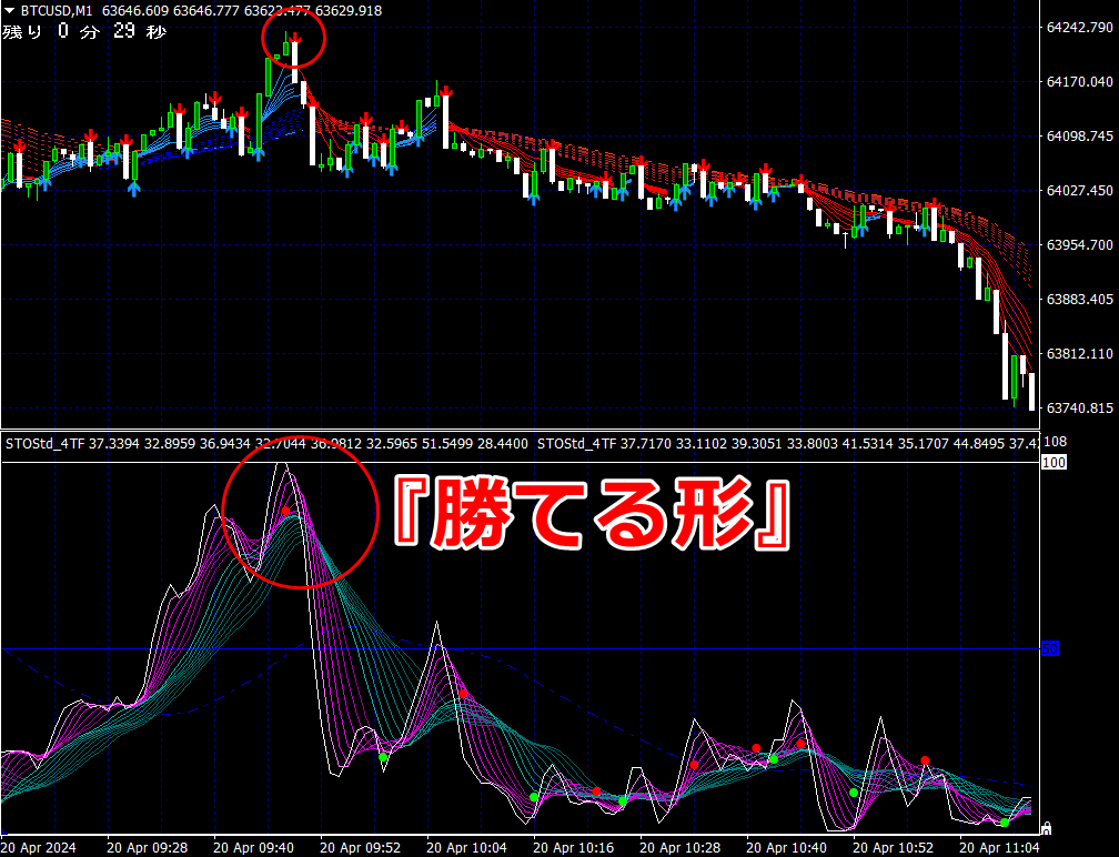 ② 矢印サイン点灯状態で、インジケーターのピンク色の帯が、緑の帯を下からすくい上げるような形状であれば、現在のローソク足が確定する数秒前か確定の直後に1分判定または3分判定でハイエントリーします。