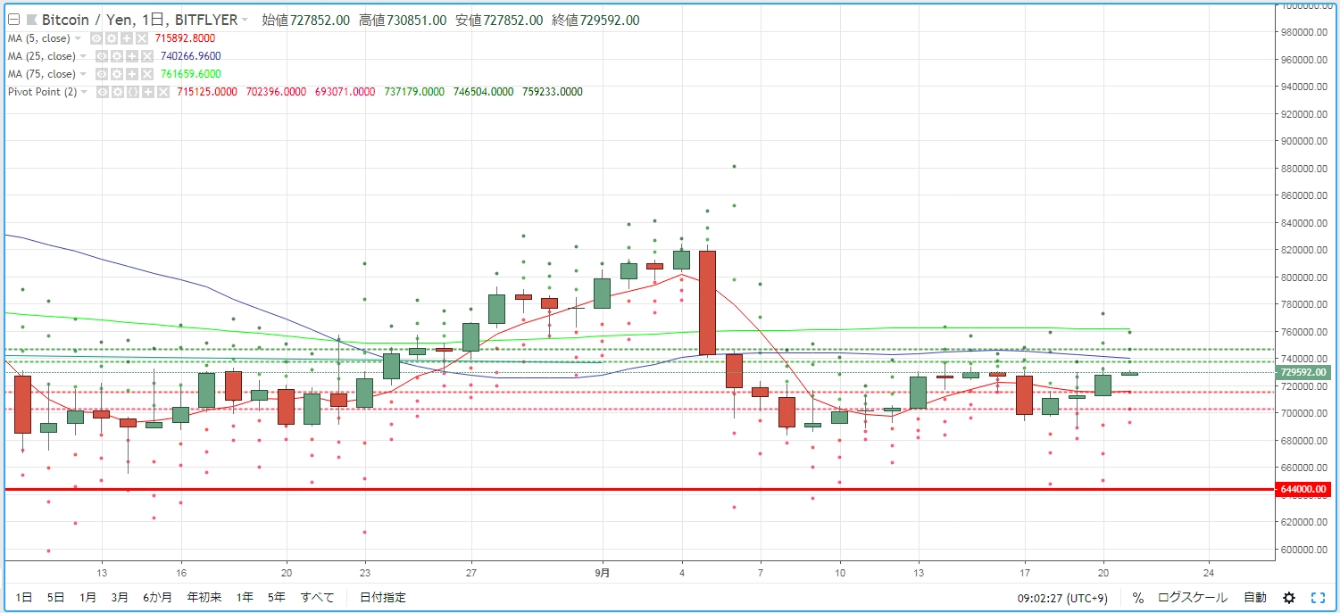 画像は2018年9月22日のキャプチャ。昨日は強気の「緑」になっていました。それを引き継いで、今日も「新緑」を交えた強気の相場環境となっています。特にリップルの上昇が目を引きます。