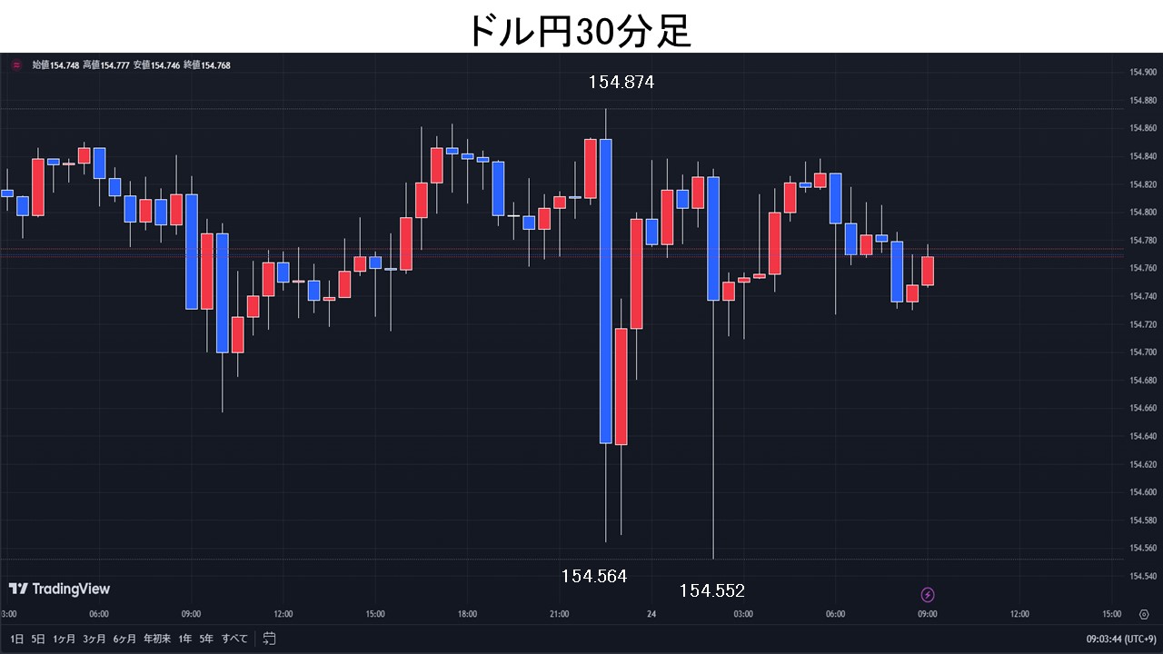 東京時間、鈴木財務相が国会答弁で「(介入)環境が整ったと捉えられてもいい」などと発言すると、ドル円は154.66円まで下押しとなるが、その後は押し目買いで154.80円近辺まで上昇。欧州時間、中東情勢が落ち着く中、リスク・オン状態となり欧米株価指数が上昇。米長期金利の上昇などもあり、ドル円は154.87円と1990年6月以来約34年ぶりの高値を更新。NY時間、米PMI(米購買担当者景気指数)速報値が予想を下振れると、米長期金利が低下に転じ、ドル円は154.56円まで下落。しかし、安値での買い意欲も強く154円台後半まで買い戻された。